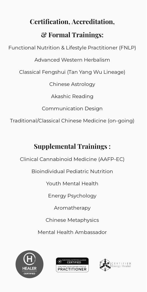 Nicole is a certified practitioner in Functional Nutrition, Western Herbalism, Classical Fengshui and Metaphysical readings, as well as a committed TCM student for lifetime. Her path began not in theory, but in lived experience. From a young age, she navigated autoimmune and chronic illness, learning firsthand how the body and spirit speak to one another. Witnessing the quiet struggles within her community — the sensitive, the intuitive, and those existing at the edges of conventional systems — inspired a deeper inquiry: How can the wisdom of the past meet the needs of modern life?