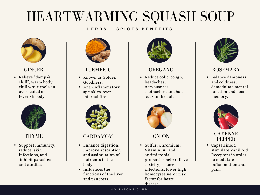 The Three Brains — head, heart, and gut are all affected by seasonal change. Dull skin, slower cognition, indigestion, and low mood can all be signs of cold-damp stagnation in the body. Soup offers warmth, moisture, and digestibility. Spices, seeds, and roots also bring protective compounds: anti-inflammatory, antimicrobial, antiviral, and even adaptogenic properties that guard against seasonal stress.